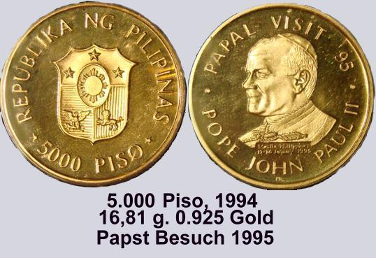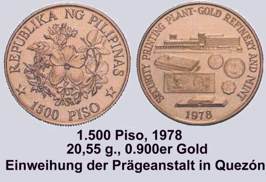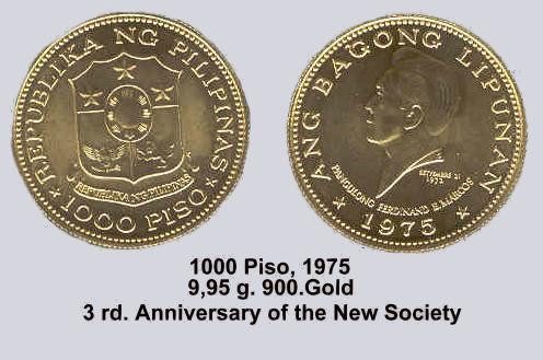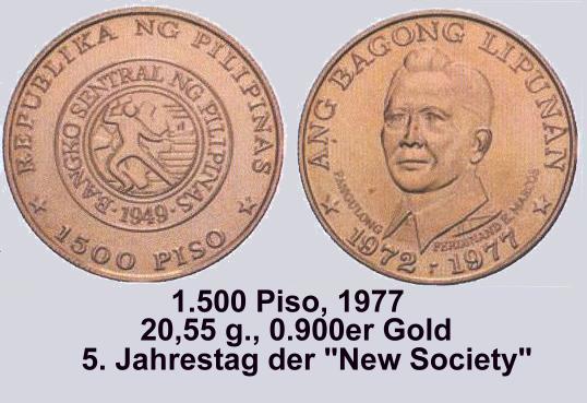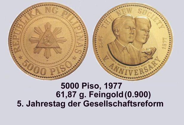 Die schwerste Goldmünze ist wohl die 1977 erschienene 5.000 Piso Münze "5th ANNIVERSARY of the NEW SOCIETY".