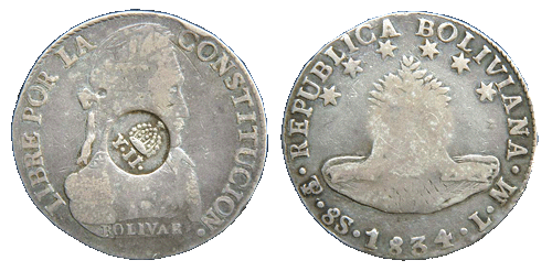 8 Soles, Bolivien, 1834 LM mit Counterstamp Isabell II (YII)