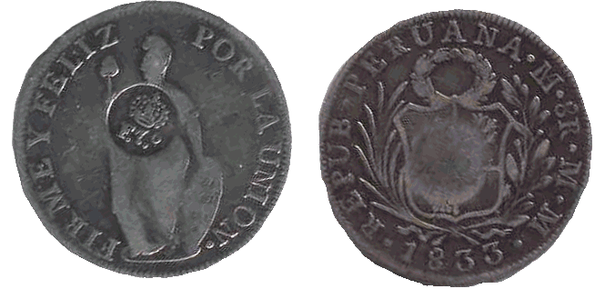 8 Reales, Peru, 1833 mit Counterstamp Ferdinand VII (F7)