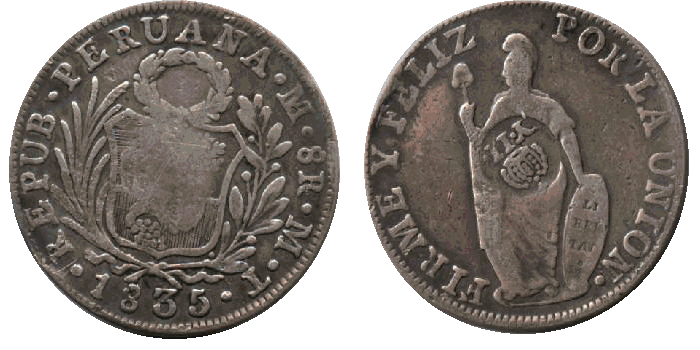 8 Reales, Peru, 1835 mit Counterstamp Isabell II (YII)